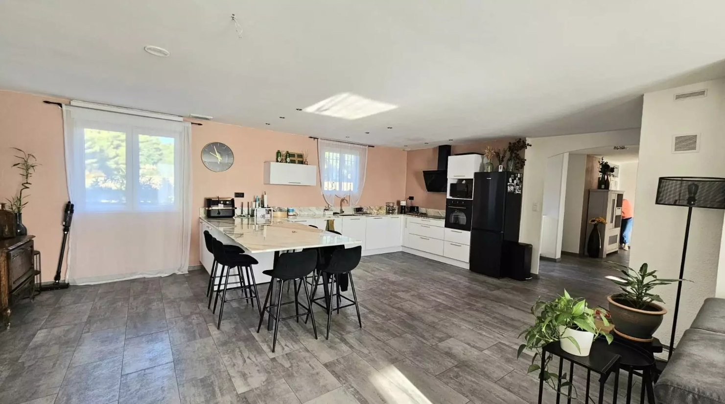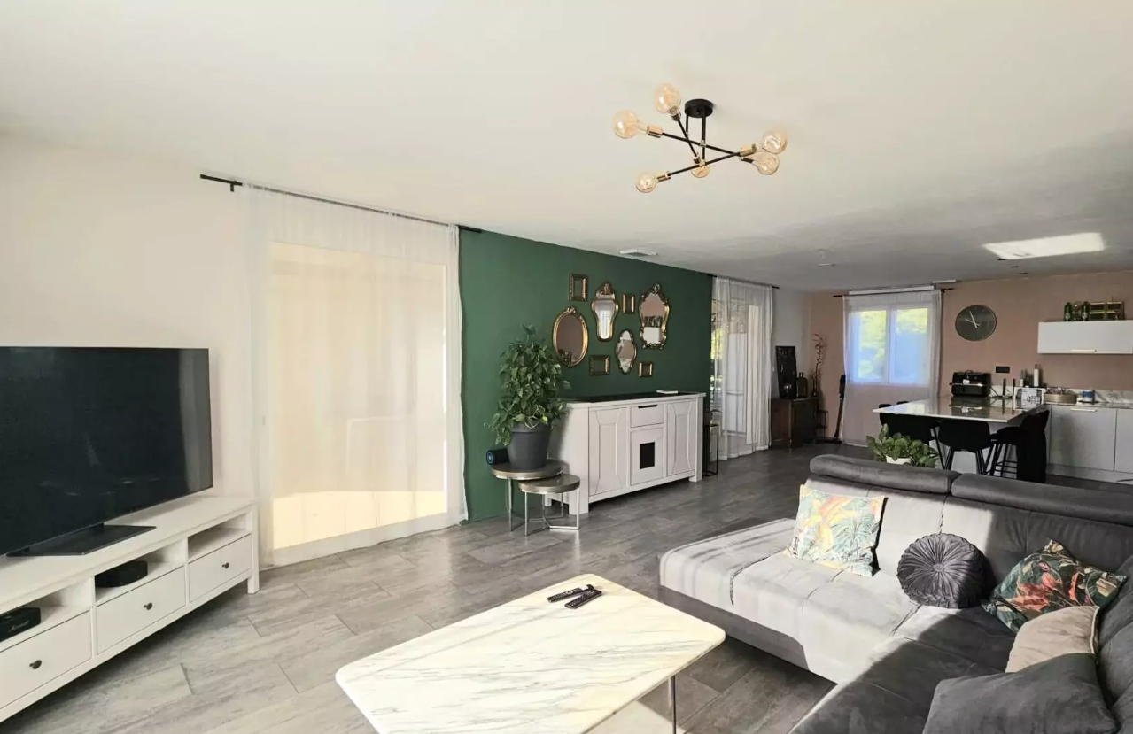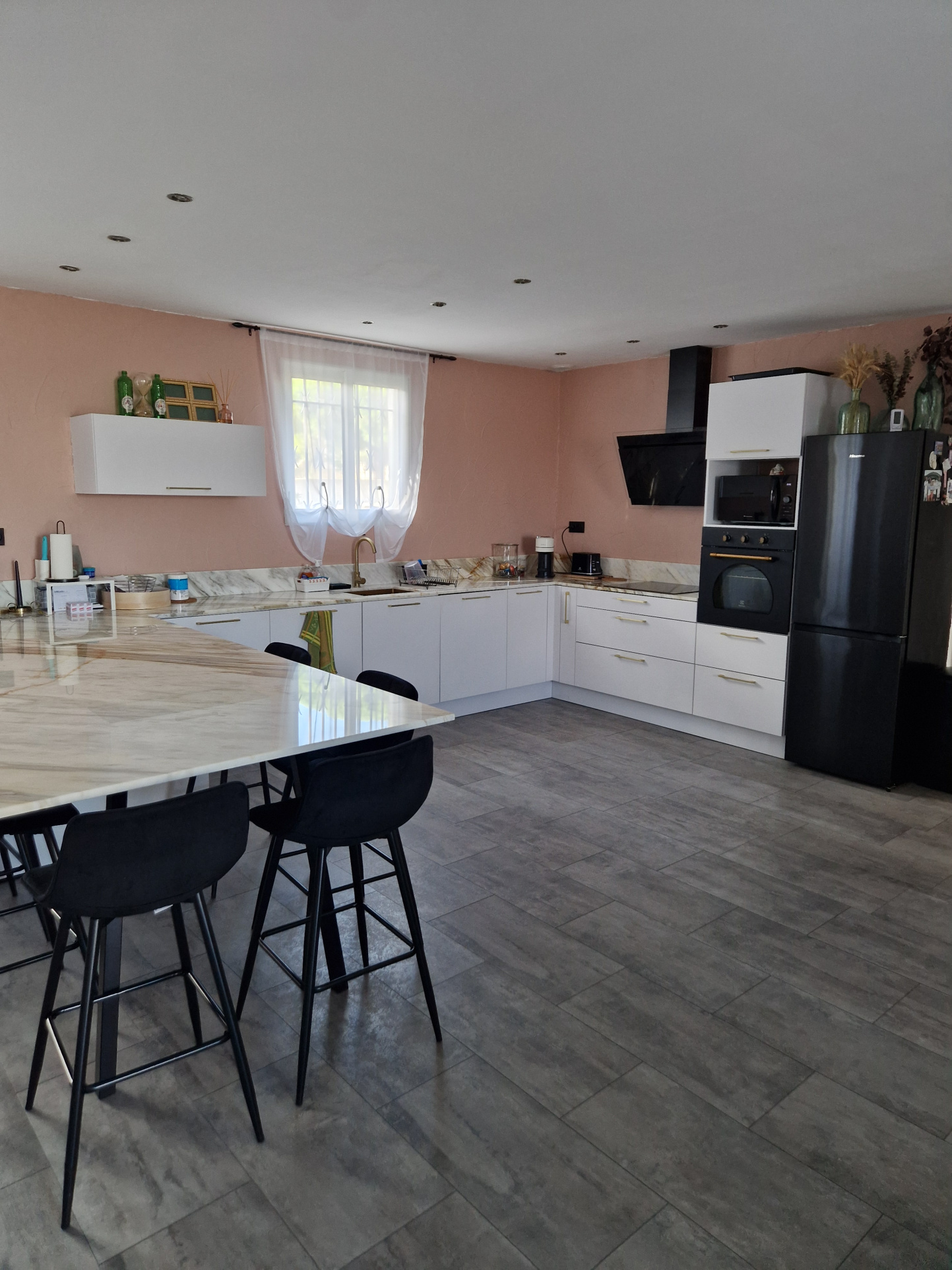 L'office de l'immobilier vous propose une villa de plain-pied de type 5, située au calme, au fond d’une impasse, sur un terrain clos et arboré de 600 m² (trois faces). Elle se compose d’un vaste hall d’entrée, ouvrant sur une spacieuse pièce de vie de 56 m² avec cuisine américaine neuve entièrement aménagée, vous disposerez d'une cheminée insert pour des moments chaleureux. Un grand couloir dessert le coin nuit, comprenant trois chambres avec placards, une salle de bain ajourée et spacieuse, ainsi que des toilettes indépendantes. La maison offre également un bureau, une buanderie, une grande terrasse couverte type loggia, et un sous-sol de 35 m² idéal pour le stockage . Vous pourrez stationner plusieurs véhicules sur le terrain. Les équipement: climatisation réversible gainable -double vitrage aluminium et PVC. Aucun travaux à prévoir - Une belle opportunité pour profiter d’un environnement calme et serein tout en restant proche des commodités. Contact; Cyril DAVID Les honoraires sont à la charge des vendeurs .