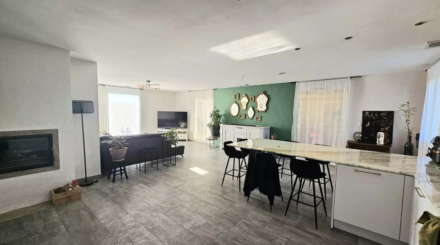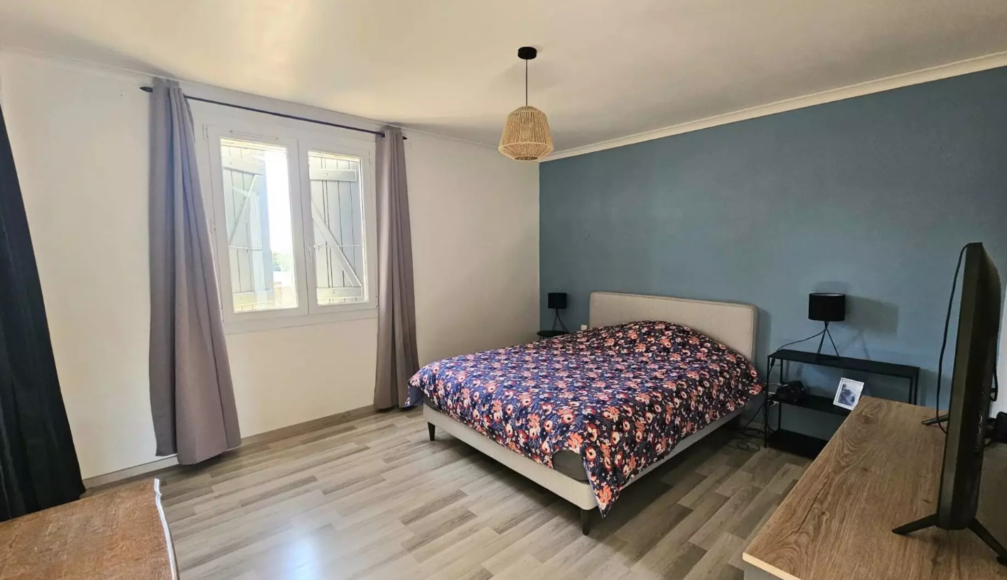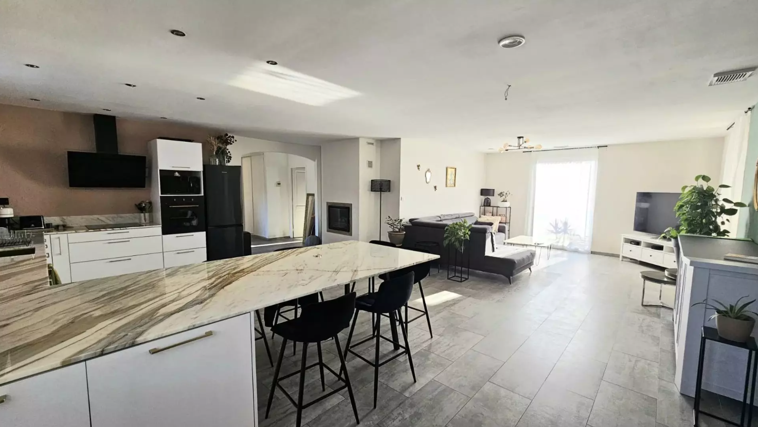L'office de l'immobilier vous propose une villa de plain-pied de type 5, située au calme, au fond d’une impasse, sur un terrain clos et arboré de 600 m² (trois faces). Elle se compose d’un vaste hall d’entrée, ouvrant sur une spacieuse pièce de vie de 56 m² avec cuisine américaine neuve entièrement aménagée, vous disposerez d'une cheminée insert pour des moments chaleureux. Un grand couloir dessert le coin nuit, comprenant trois chambres avec placards, une salle de bain ajourée et spacieuse, ainsi que des toilettes indépendantes. La maison offre également un bureau, une buanderie, une grande terrasse couverte type loggia, et un sous-sol de 35 m² idéal pour le stockage . Vous pourrez stationner plusieurs véhicules sur le terrain. Les équipement: climatisation réversible gainable -double vitrage aluminium et PVC. Aucun travaux à prévoir - Une belle opportunité pour profiter d’un environnement calme et serein tout en restant proche des commodités. Contact; Cyril DAVID Les honoraires sont à la charge des vendeurs .